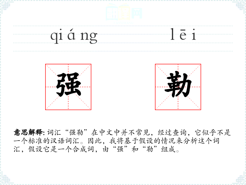 词汇“强勒”在中文中并不常见,经过查询,它似乎不是一个标准的汉语词汇。因此,我将基于假设的情况来分析这个词汇,假设它是一个合成词,由“强”和“勒”组成。