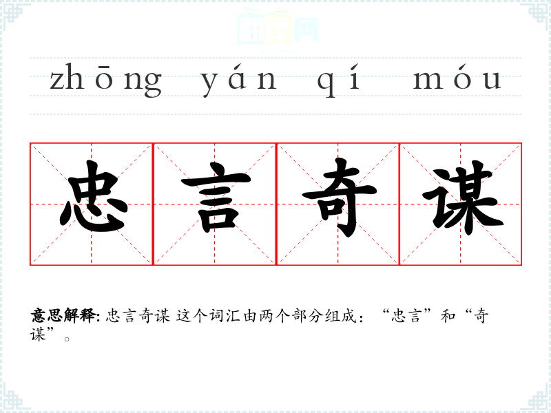 忠言奇谋 这个词汇由两个部分组成:“忠言”和“奇谋”。