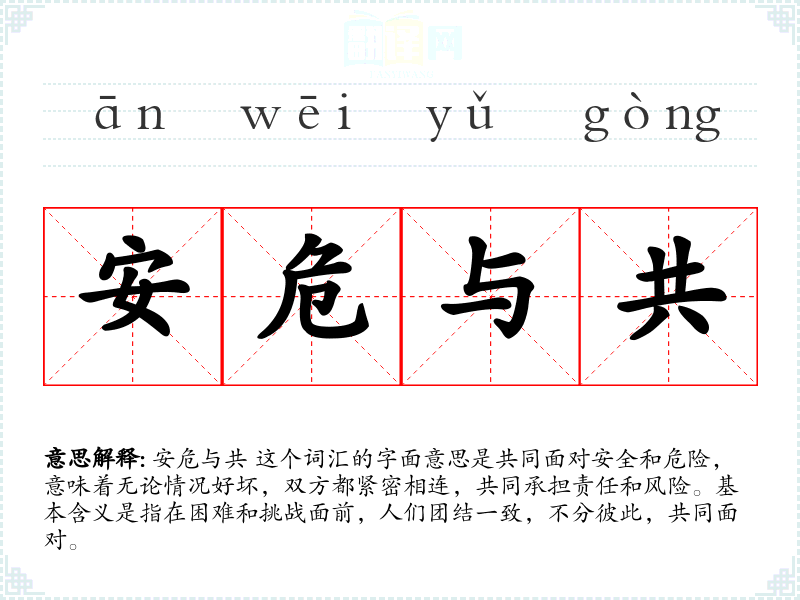 在英语中,安危与共 可以对应词汇如 "in good times and bad" 或 "through thick and thin",都表达了在各种情况下保持团结和支持的含义。