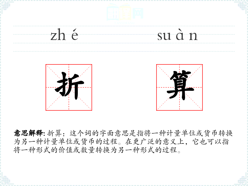 折算:这个词的字面意思是指将一种计量单位或货币转换为另一种计量单位或货币的过程。在更广泛的意义上,它也可以指将一种形式的价值或数量转换为另一种形式的过程。