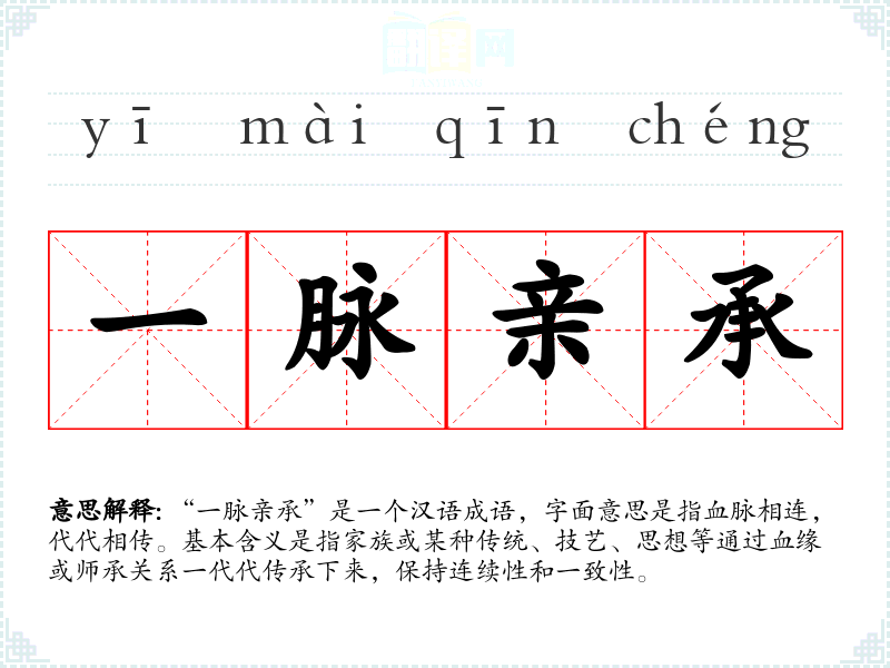 “一脉亲承”是一个汉语成语,字面意思是指血脉相连,代代相传。基本含义是指家族或某种传统、技艺、思想等通过血缘或师承关系一代代传承下来,保持连续性和一致性。
