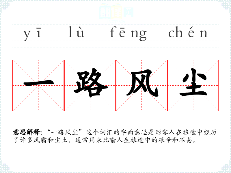 “一路风尘”这个词汇的字面意思是形容人在旅途中经历了许多风霜和尘土,通常用来比喻人生旅途中的艰辛和不易。