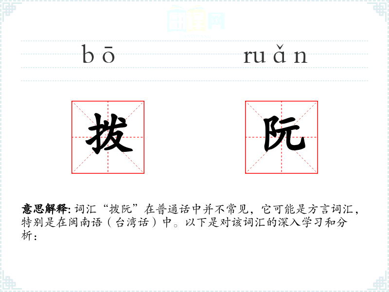 词汇“拨阮”在普通话中并不常见,它可能是方言词汇,特别是在闽南语(台湾话)中。以下是对该词汇的深入学习和分析: