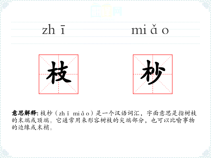 枝杪(zhī miǎo)是一个汉语词汇,字面意思是指树枝的末端或顶端。它通常用来形容树枝的尖端部分,也可以比喻事物的边缘或末梢。