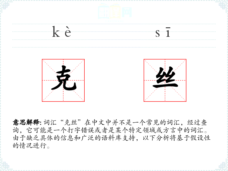 词汇“克丝”在中文中并不是一个常见的词汇,经过查询,它可能是一个打字错误或者是某个特定领域或方言中的词汇。由于缺乏具体的信息和广泛的语料库支持,以下分析将基于假设性的情况进行。