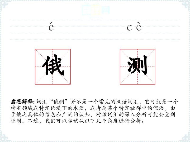 由于“俄测”不是一个标准汉语词汇,我们无法提供一个确切的基本定义。它可能是由“俄”和“测”两个字组合而成的,其中“俄”可能与俄罗斯有关,而“测”通常指测量或测试。因此,“俄测”可能与俄罗斯的测量或测试有关,但这仅仅是基于字面意义的猜测。