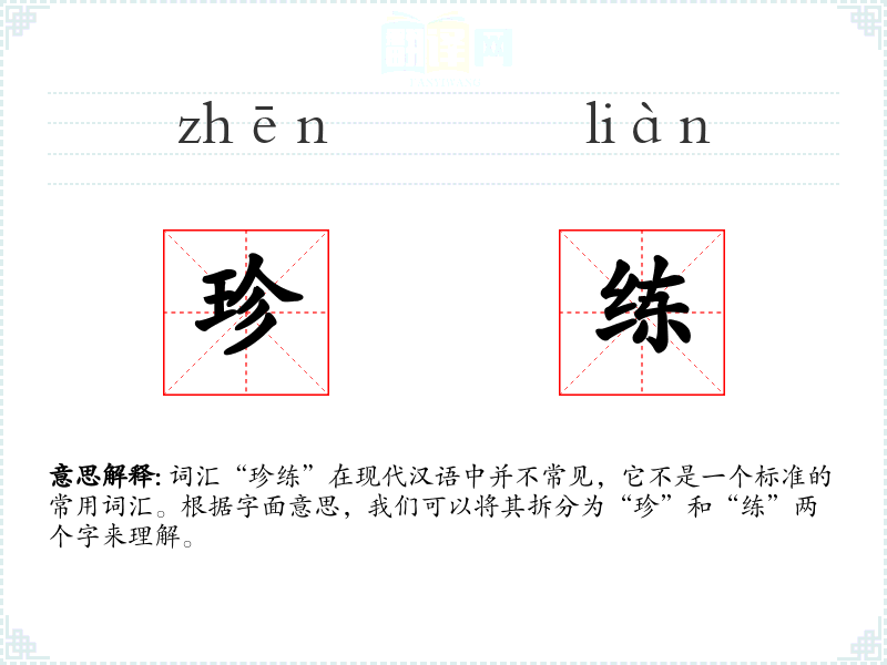 词汇“珍练”在现代汉语中并不常见,它不是一个标准的常用词汇。根据字面意思,我们可以将其拆分为“珍”和“练”两个字来理解。
