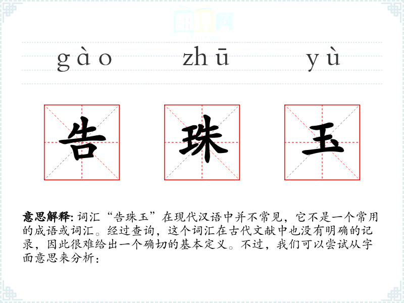 词源与演变: 由于“告珠玉”不是一个常用词汇,其词源和历史演变不详。