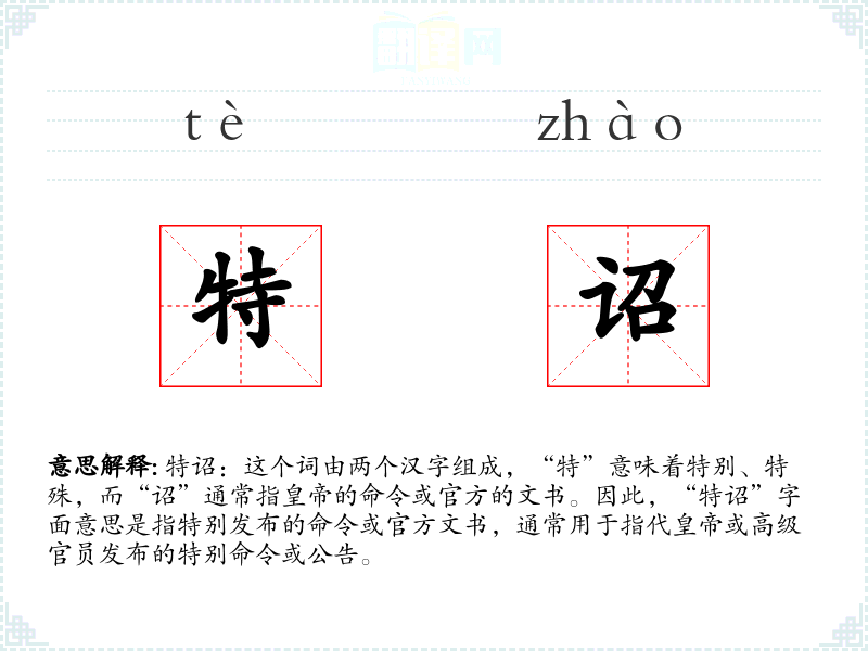 特诏:这个词由两个汉字组成,“特”意味着特别、特殊,而“诏”通常指的命令或官方的文书。因此,“特诏”字面意思是指特别发布的命令或官方文书,通常用于指代或高级官员发布的特别命令或公告。