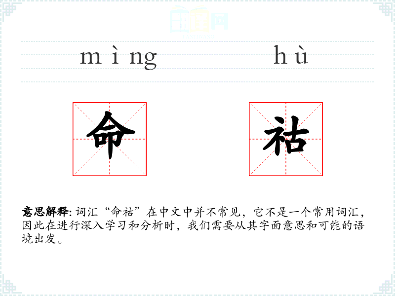 词汇“命祜”在中文中并不常见,它不是一个常用词汇,因此在进行深入学*和分析时,我们需要从其字面意思和可能的语境出发。
