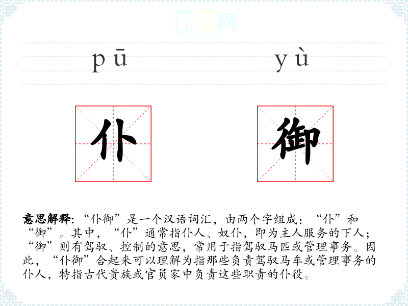 “仆御”的词源可以追溯到古代汉语,其中“仆”字最早见于甲骨文,意为仆人;“御”字则有更早的驾驭马匹的含义。随着时间的推移,“仆御”逐渐固定为一个词汇,专门指代那些负责驾驭和管理事务的仆人。