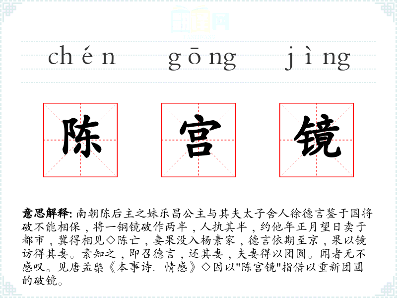 1.南朝陈后主之妹乐昌公主与其夫太子舍人徐德言鉴于国将破不能相保﹐将一铜镜破作两半﹐人执其半﹐约他年正月望日卖于都市﹐冀得相见◇陈亡﹐妻果没入杨素家﹐德言依期至京﹐果以镜访得其妻。素知之﹐即召德言﹐还其妻﹐夫妻得以团圆。闻者无不感叹。见唐孟棨《本事诗.情感》◇因以"陈宫镜"指借以重新团圆的破镜。