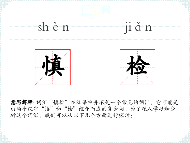 词汇“慎检”在汉语中并不是一个常见的词汇,它可能是由两个汉字“慎”和“检”组合而成的复合词。为了深入学*和分析这个词汇,我们可以从以下几个方面进行探讨: