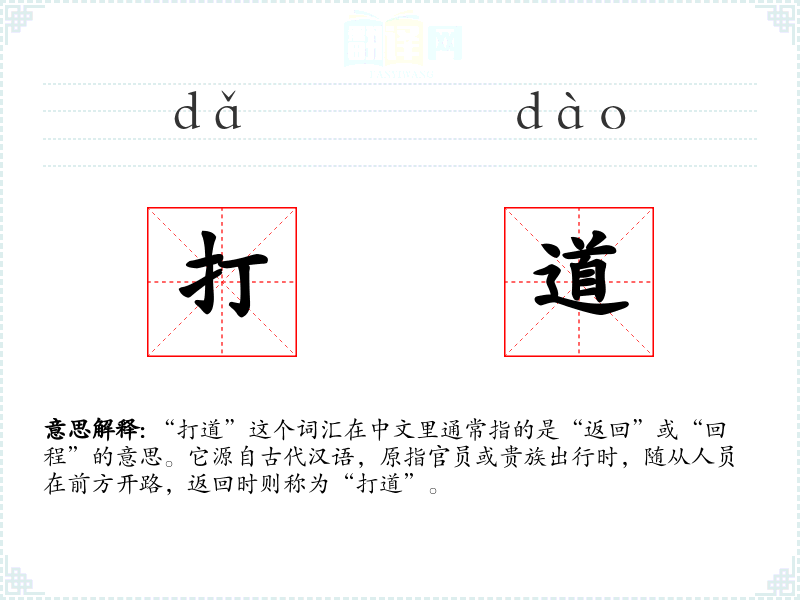 “打道”这个词汇在中文里通常指的是“返回”或“回程”的意思。它源自古代汉语,原指官员或贵族出行时,随从人员在前方开路,返回时则称为“打道”。