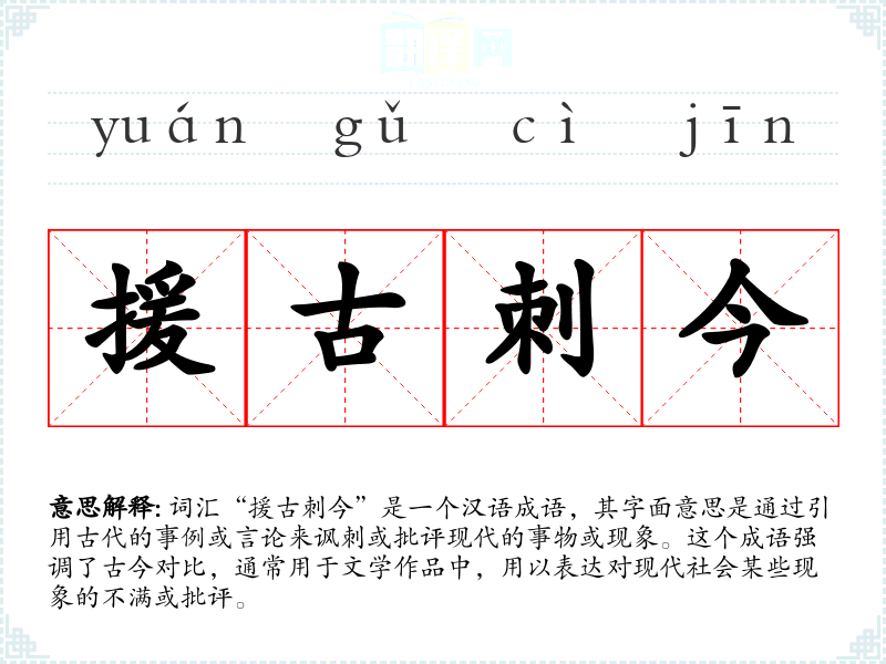 词汇“援古刺今”是一个汉语成语,其字面意思是通过引用古代的事例或言论来讽刺或批评现代的事物或现象。这个成语强调了古今对比,通常用于文学作品中,用以表达对现代社会某些现象的不满或批评。