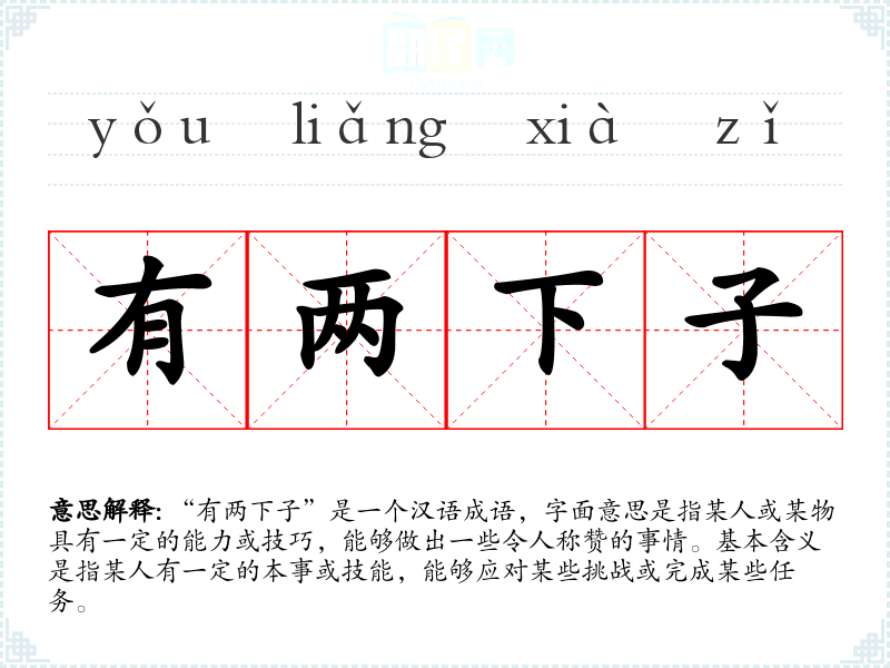 “有两下子”是一个汉语成语,字面意思是指某人或某物具有一定的能力或技巧,能够做出一些令人称赞的事情。基本含义是指某人有一定的本事或技能,能够应对某些挑战或完成某些任务。