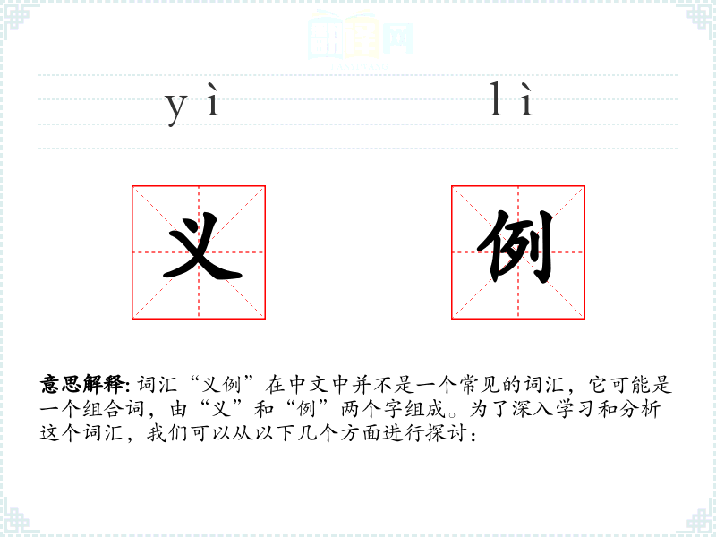 - “义例”这个词汇虽然不常见,但它强调了例子与道德或法律意义之间的联系,对于理解和传达复杂的道德或法律概念具有重要意义。在语言学*和表达中,了解和正确使用这样的词汇可以增强表达的准确性和深度。