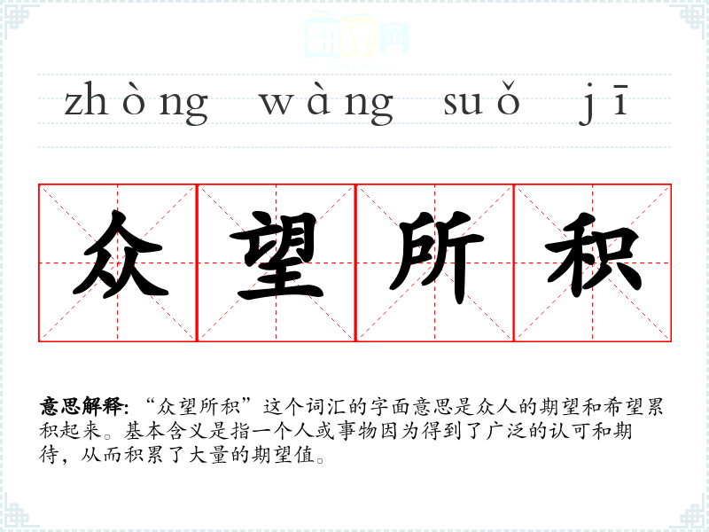 “众望所积”这个词汇的字面意思是众人的期望和希望累积起来。基本含义是指一个人或事物因为得到了广泛的认可和期待,从而积累了大量的期望值。