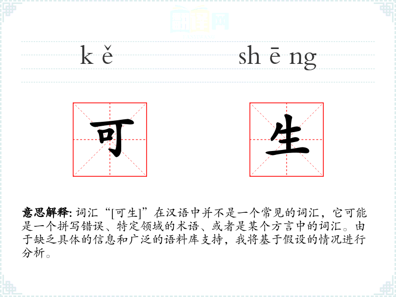 词汇“[可生]”在汉语中并不是一个常见的词汇,它可能是一个拼写错误、特定领域的术语、或者是某个方言中的词汇。由于缺乏具体的信息和广泛的语料库支持,我将基于假设的情况进行分析。