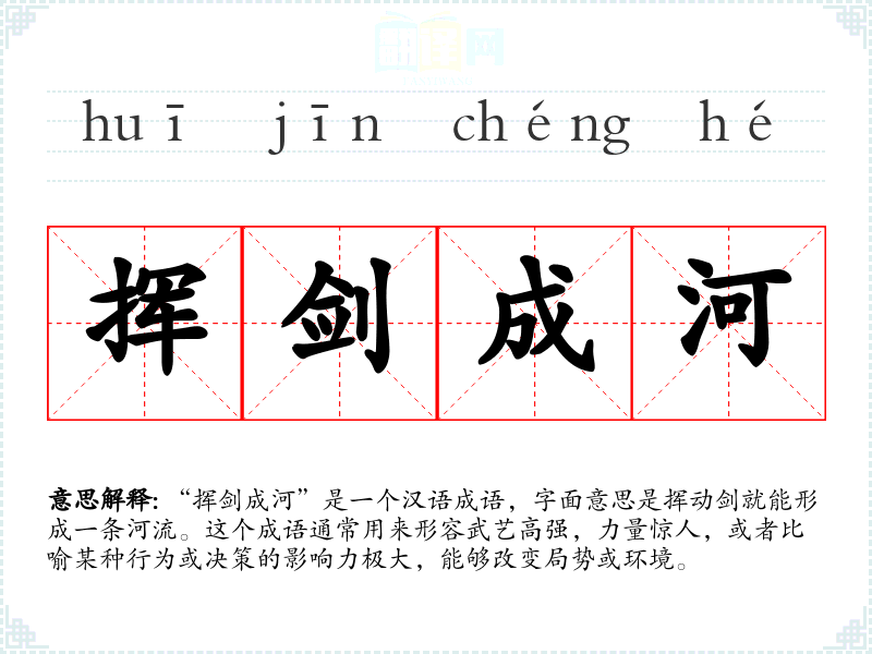 “挥剑成河”是一个汉语成语,字面意思是挥动剑就能形成一条河流。这个成语通常用来形容武艺高强,力量惊人,或者比喻某种行为或决策的影响力极大,能够改变局势或环境。