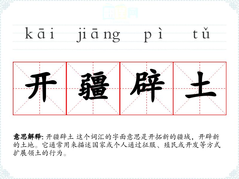 开疆辟土 这个词汇的字面意思是开拓新的疆域,开辟新的土地。它通常用来描述国家或个人通过征服、殖民或开发等方式扩展领土的行为。