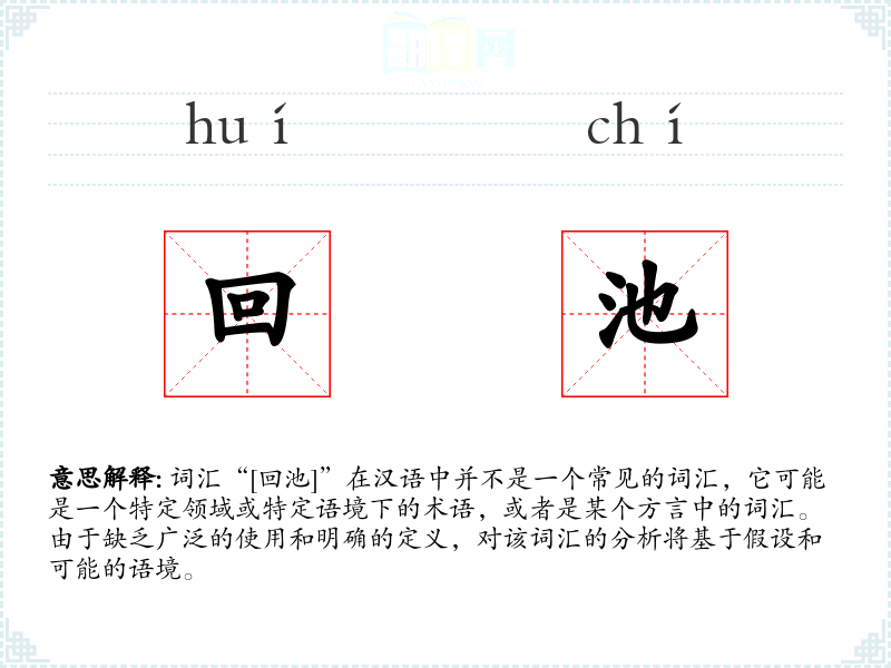 词汇“[回池]”在汉语中并不是一个常见的词汇,它可能是一个特定领域或特定语境下的术语,或者是某个方言中的词汇。由于缺乏广泛的使用和明确的定义,对该词汇的分析将基于假设和可能的语境。