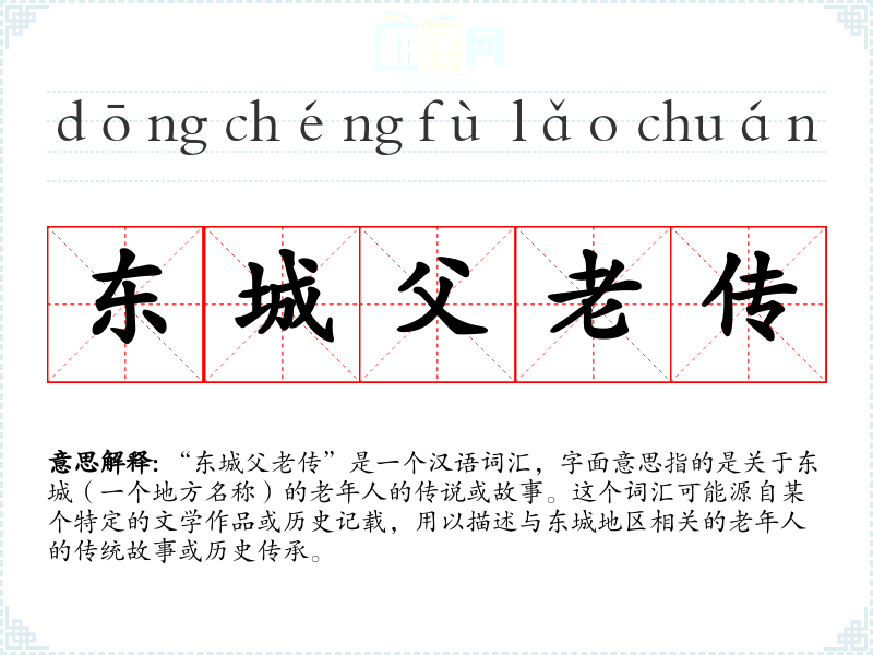 “东城父老传”是一个汉语词汇,字面意思指的是关于东城(一个地方名称)的老年人的传说或故事。这个词汇可能源自某个特定的文学作品或历史记载,用以描述与东城地区相关的老年人的传统故事或历史传承。