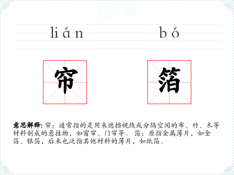 帘:在文化中,帘子常用于家居装饰,也常在文学作品中象征隐私和隔离。 箔:在文化中,金箔、银箔常用于装饰佛像或其他神圣物品,象征神圣和尊贵。