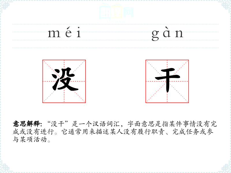 “没干”是一个汉语词汇,字面意思是指某件事情没有完成或没有进行。它通常用来描述某人没有履行职责、完成任务或参与某项活动。