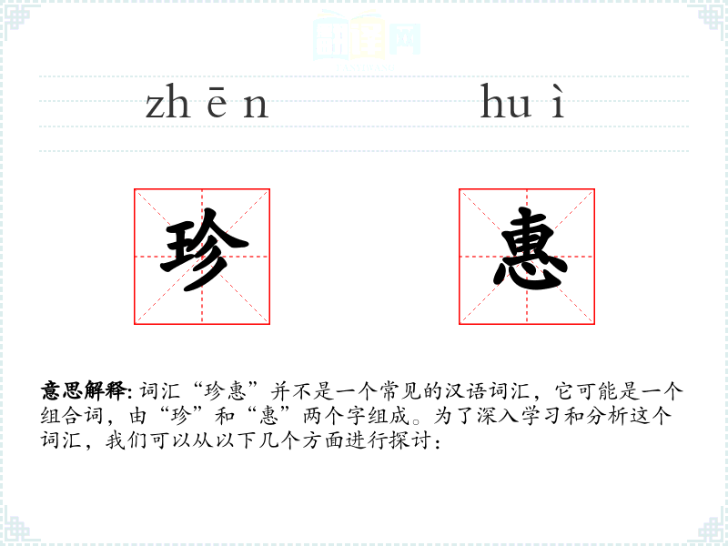 词汇“珍惠”并不是一个常见的汉语词汇,它可能是一个组合词,由“珍”和“惠”两个字组成。为了深入学习和分析这个词汇,我们可以从以下几个方面进行探讨:
