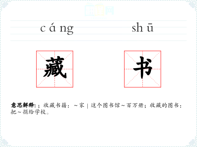;收藏书籍:~家|这个图书馆~百万册;收藏的图书:把~捐给学校。