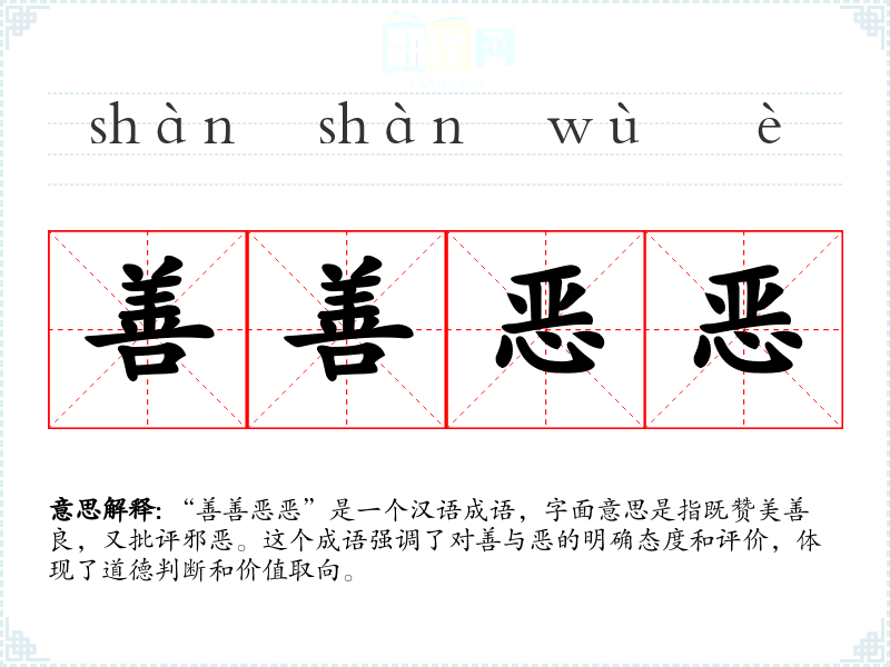 “善善恶恶”是一个汉语成语,字面意思是指既赞美善良,又批评邪恶。这个成语强调了对善与恶的明确态度和评价,体现了道德判断和价值取向。
