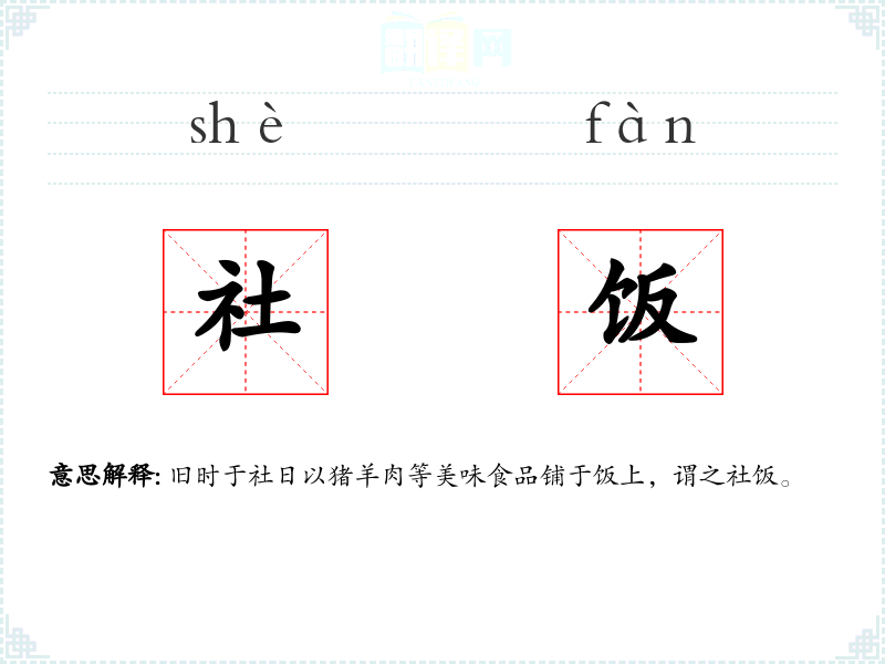旧时于社日以猪羊肉等美味食品铺于饭上,谓之社饭。