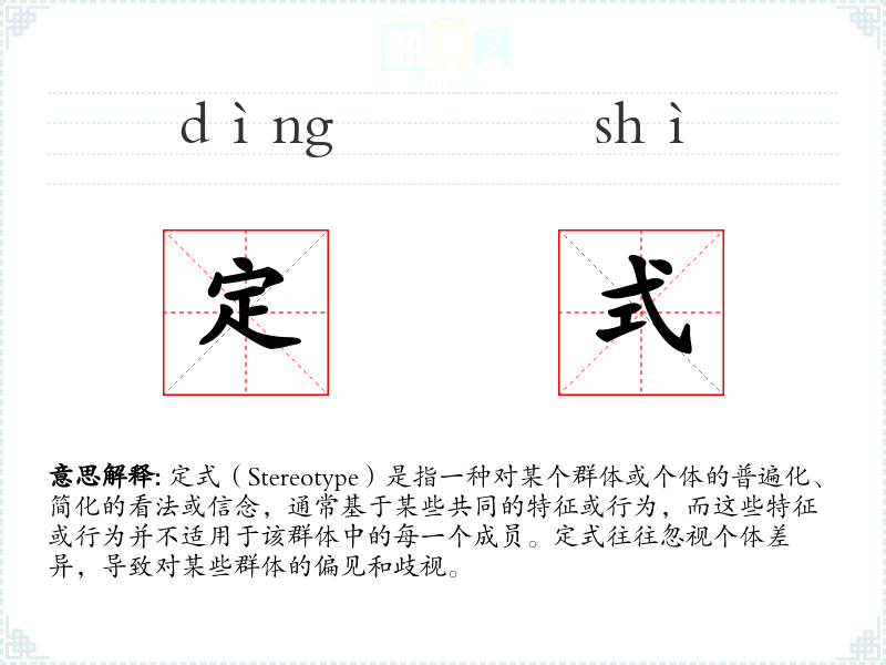 定式(Stereotype)是指一种对某个群体或个体的普遍化、简化的看法或信念,通常基于某些共同的特征或行为,而这些特征或行为并不适用于该群体中的每一个成员。定式往往忽视个体差异,导致对某些群体的偏见和歧视。
