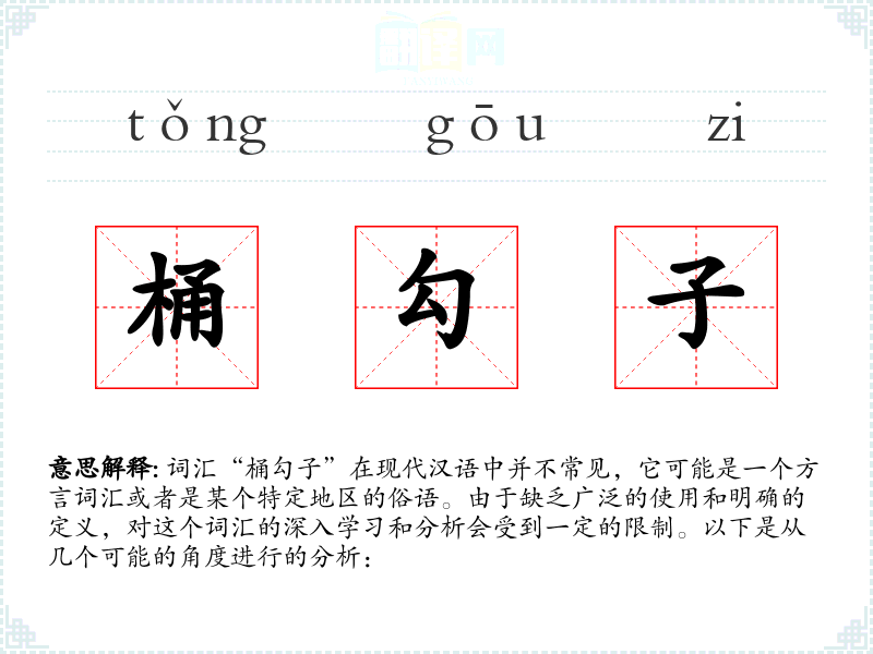 词汇“桶勾子”在现代汉语中并不常见,它可能是一个方言词汇或者是某个特定地区的俗语。由于缺乏广泛的使用和明确的定义,对这个词汇的深入学习和分析会受到一定的限制。以下是从几个可能的角度进行的分析: