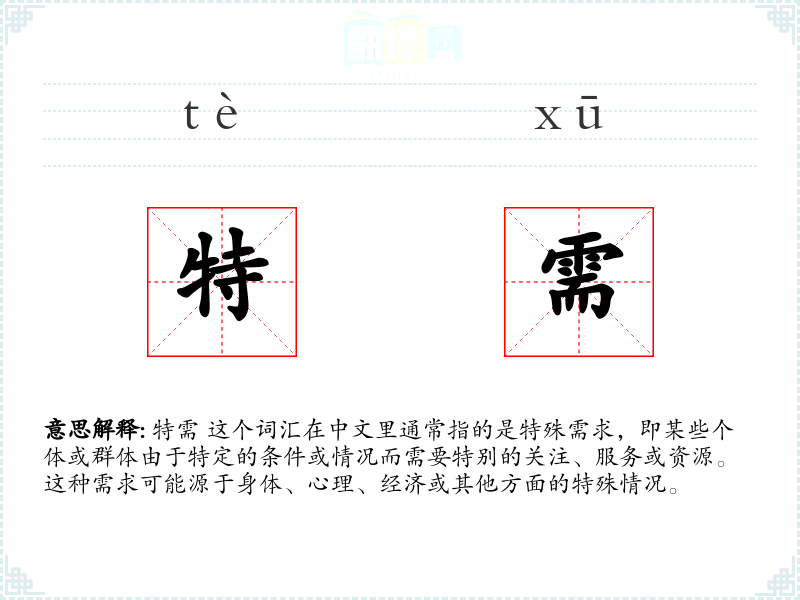 “特需”这个词汇在中文中是一个相对现代的词汇,主要在20世纪后期随着社会对特殊群体关注度的提高而逐渐流行起来。它由“特”(特殊的)和“需”(需求)两个字组成,直接表达了特殊需求的概念。