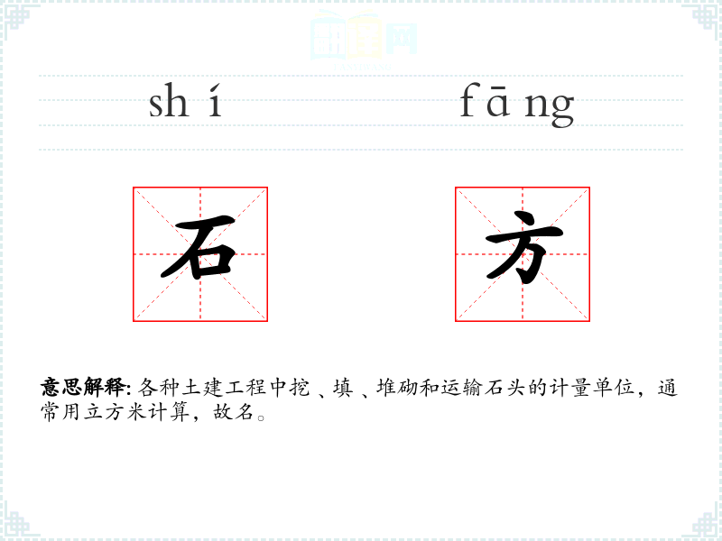 各种土建工程中挖﹑填﹑堆砌和运输石头的计量单位,通常用立方米计算,故名。