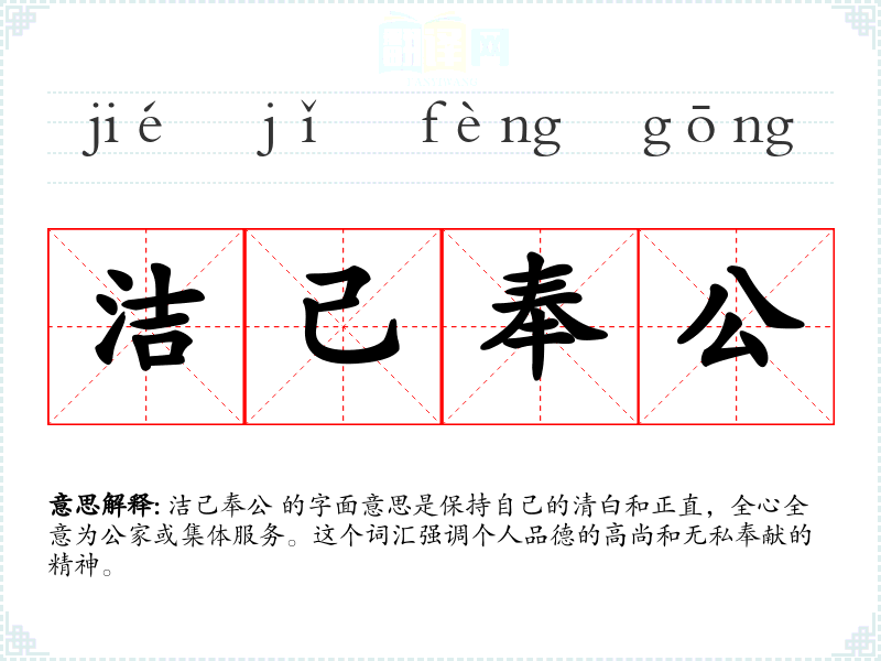 洁己奉公 的字面意思是保持自己的清白和正直,全心全意为公家或集体服务。这个词汇强调个人品德的高尚和无私奉献的精神。