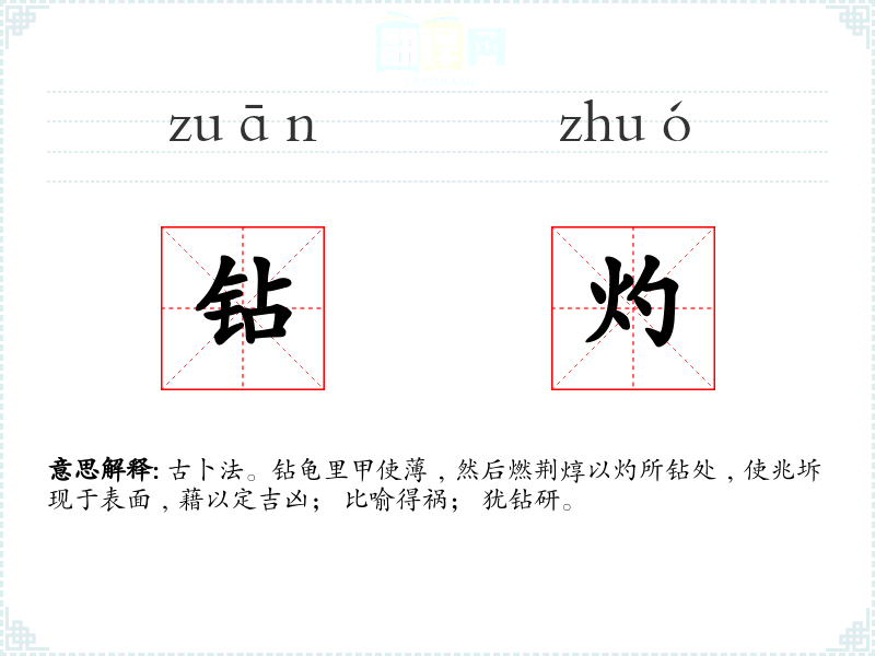 古卜法。钻龟里甲使薄﹐然后燃荆焞以灼所钻处﹐使兆坼现于表面﹐藉以定吉凶; 比喻得祸; 犹钻研。