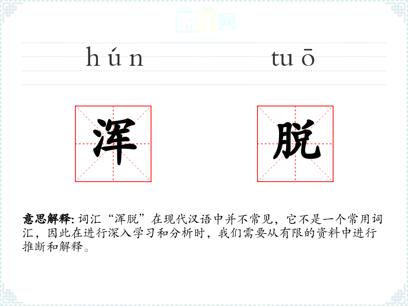 “浑脱”的字面意思并不明确,它可能是一个方言词汇或者是古代文献中的用语。根据一些资料,它可能指的是“浑浊”或“不清晰”的状态,但这种解释并不普遍,且缺乏确切的文献支持。