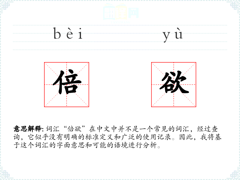 词汇“倍欲”在中文中并不是一个常见的词汇,经过查询,它似乎没有明确的标准定义和广泛的使用记录。因此,我将基于这个词汇的字面意思和可能的语境进行分析。