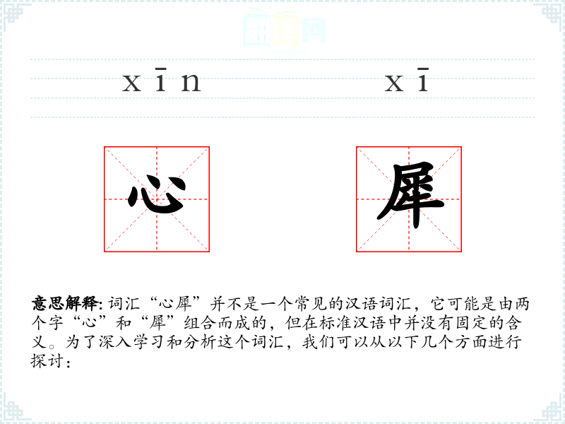 词汇“心犀”并不是一个常见的汉语词汇,它可能是由两个字“心”和“犀”组合而成的,但在标准汉语中并没有固定的含义。为了深入学习和分析这个词汇,我们可以从以下几个方面进行探讨: