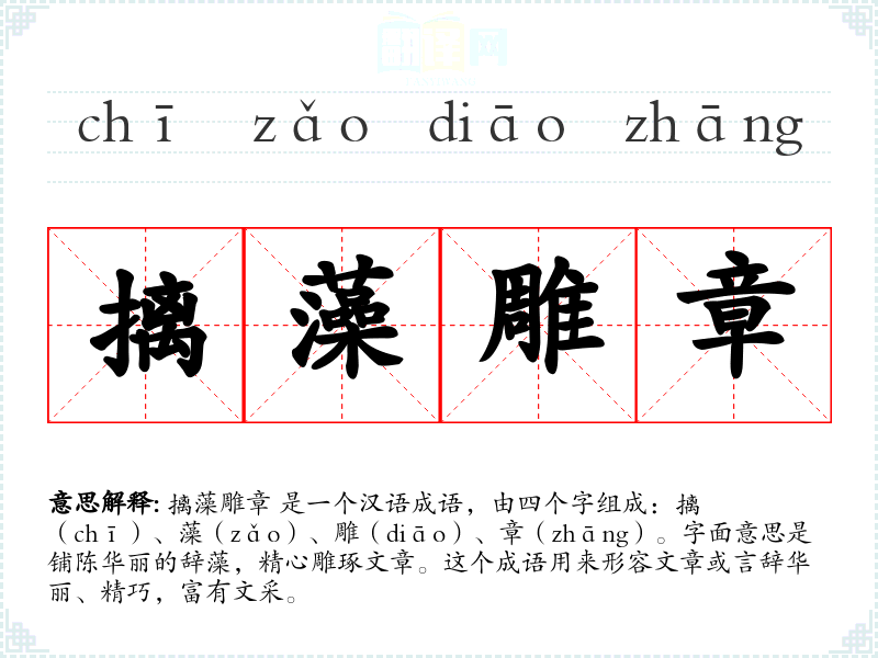 摛藻雕章 是一个汉语成语,由四个字组成:摛(chī)、藻(zǎo)、雕(diāo)、章(zhāng)。字面意思是铺陈华丽的辞藻,精心雕琢文章。这个成语用来形容文章或言辞华丽、精巧,富有文采。