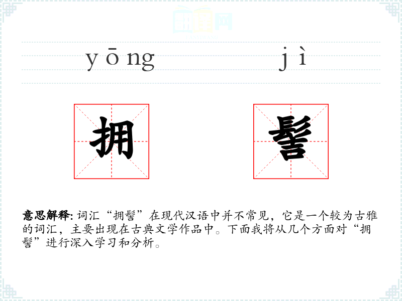 词汇“拥髻”在现代汉语中并不常见,它是一个较为古雅的词汇,主要出现在古典文学作品中。下面我将从几个方面对“拥髻”进行深入学*和分析。