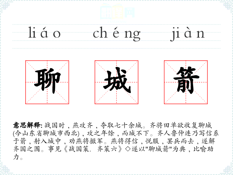 1.战国时﹐燕攻齐﹐夺取七十余城。齐将田单欲收复聊城(今山东省聊城市西北)﹐攻之年馀﹐而城不下。齐人鲁仲连乃写信系于箭﹐射入城中﹐劝燕将撤军。燕将得信﹐悦服﹐罢兵而去﹐遂解齐国之围。事见《战国策.齐策六》◇遂以"聊城箭"为典﹐比喻助力。