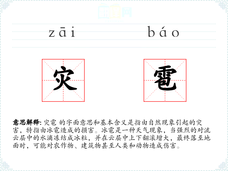 灾雹 这个词由“灾”和“雹”两个字组成。在古代汉语中,“灾”指天灾,而“雹”指冰雹。随着时间的推移,这两个字结合在一起,形成了描述由冰雹引起的灾害的词汇。