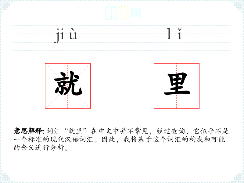词汇“就里”在中文中并不常见,经过查询,它似乎不是一个标准的现代汉语词汇。因此,我将基于这个词汇的构成和可能的含义进行分析。