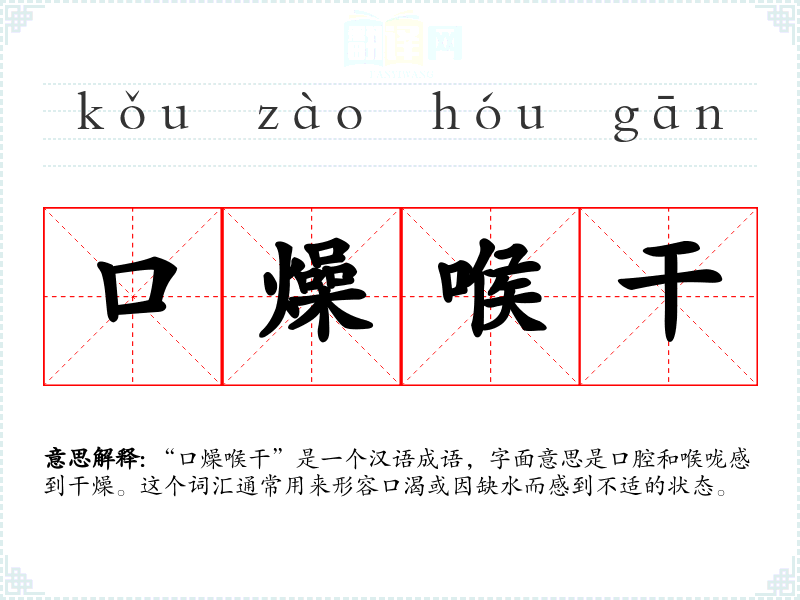 “口燥喉干”是一个汉语成语,字面意思是口腔和喉咙感到干燥。这个词汇通常用来形容口渴或因缺水而感到不适的状态。