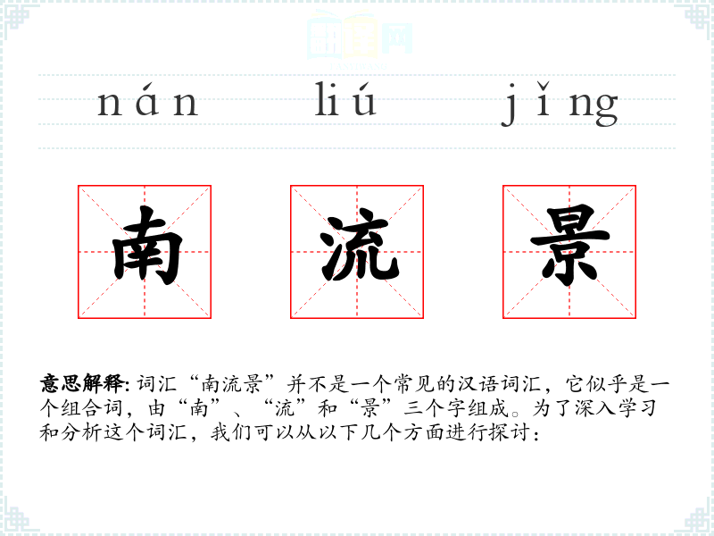词汇“南流景”并不是一个常见的汉语词汇,它似乎是一个组合词,由“南”、“流”和“景”三个字组成。为了深入学*和分析这个词汇,我们可以从以下几个方面进行探讨: