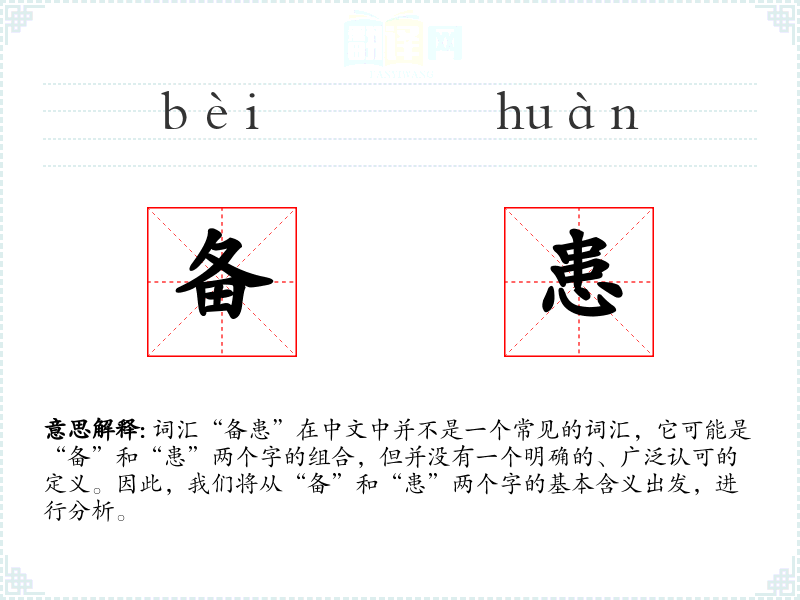 词汇“备患”在中文中并不是一个常见的词汇,它可能是“备”和“患”两个字的组合,但并没有一个明确的、广泛认可的定义。因此,我们将从“备”和“患”两个字的基本含义出发,进行分析。